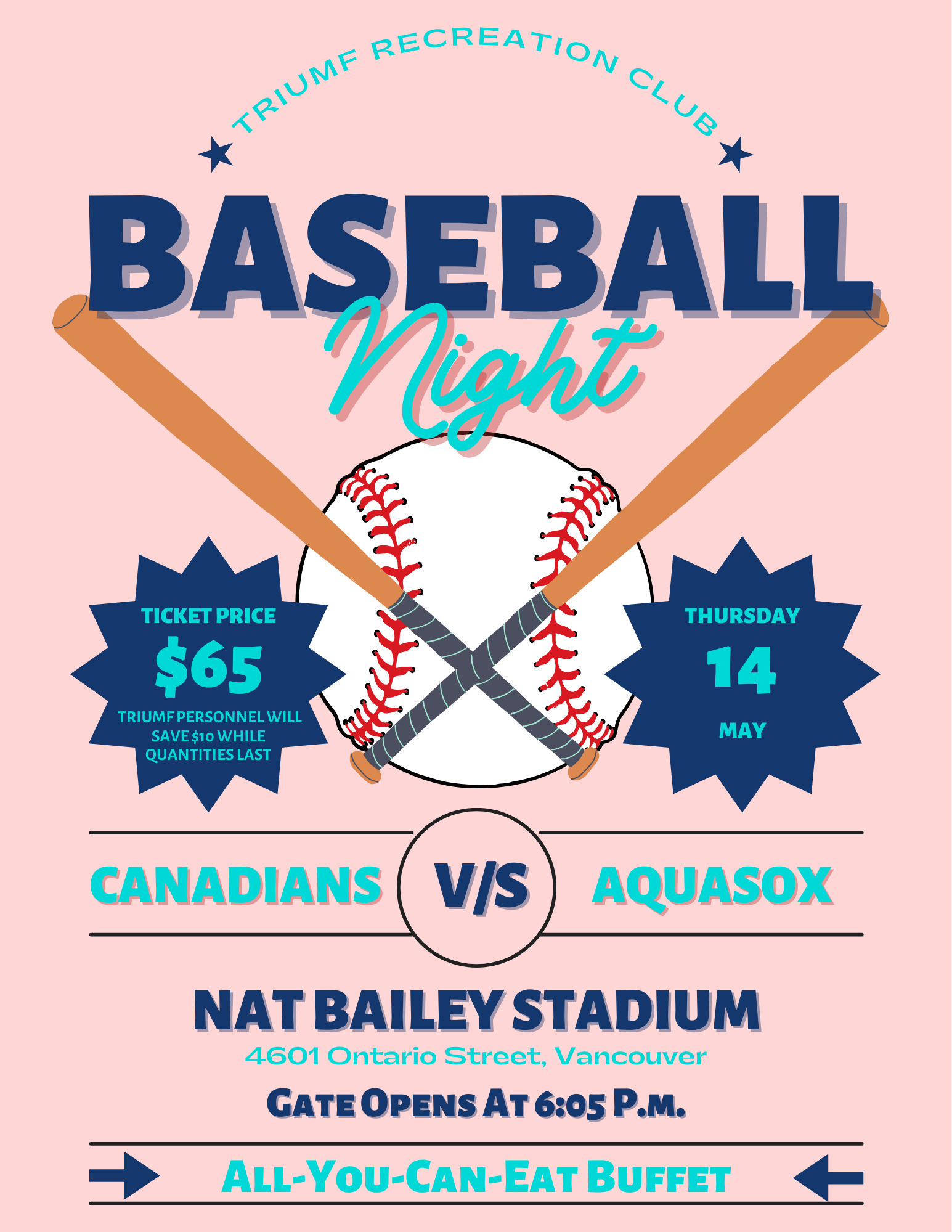 The TRIUMF Recreation Club is pleased to organize a TRIUMF night out at a Vancouver Canadians baseball game on Thursday, May 14th. The Vancouver Canadians will be playing against the Everett Aquasox at Nat Bailey Stadium.