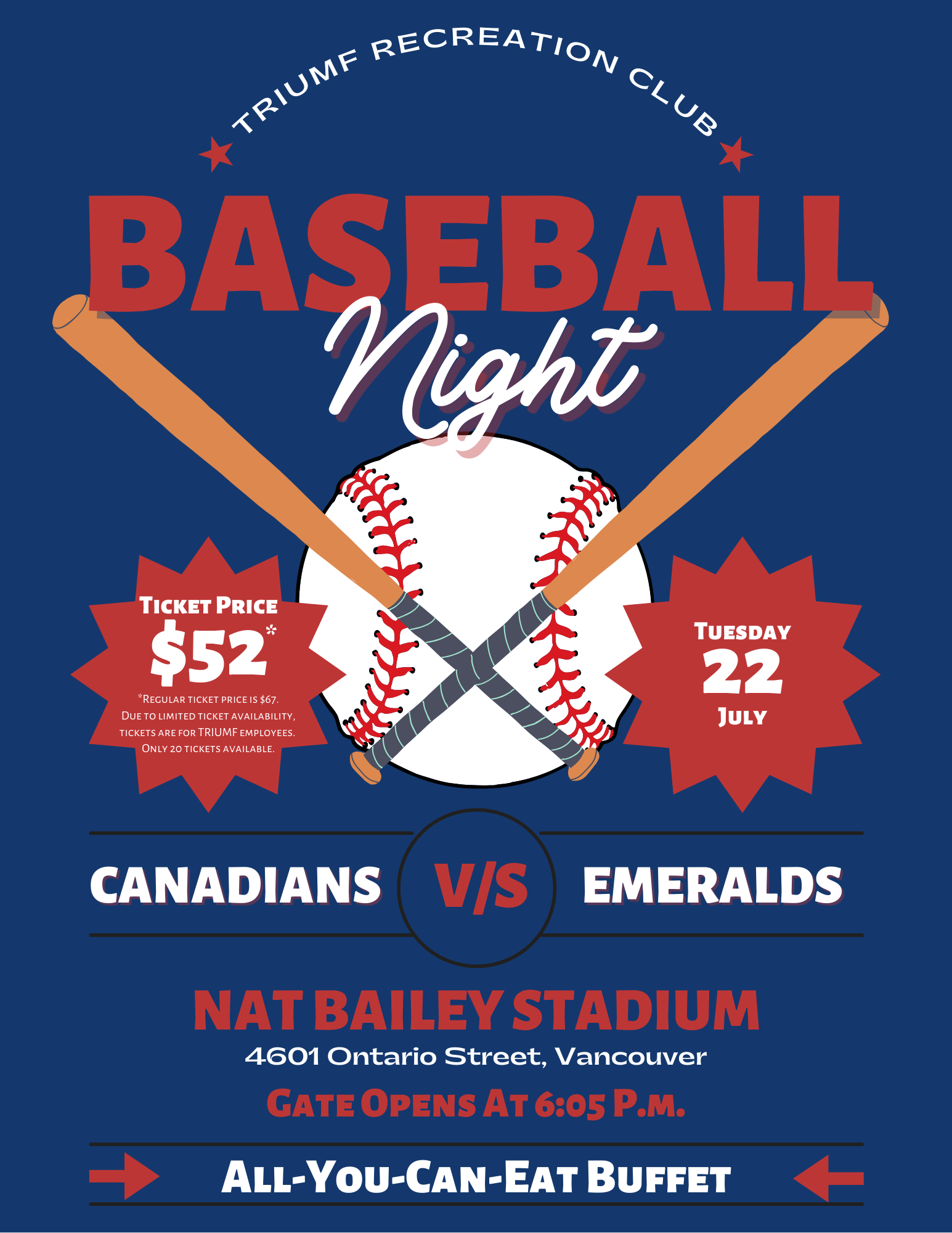The TRIUMF Recreation Club is pleased to organize a TRIUMF night out at a Vancouver Canadians baseball game on Thursday, May 14th. The Vancouver Canadians will be playing against the Everett Aquasox at Nat Bailey Stadium.